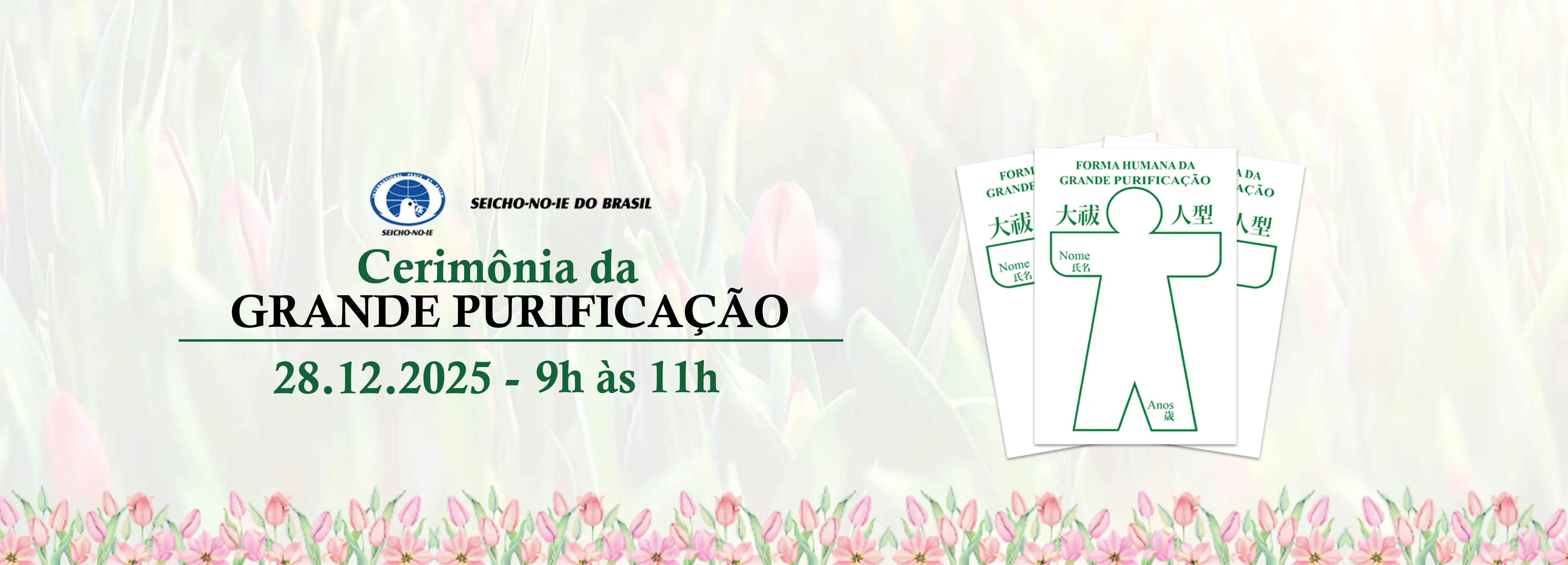 É uma importante Cerimônia que tem a finalidade de purificar pensamentos, atitudes e falas errôneas acumuladas em nossas vidas. Na Seicho-No-Ie dizemos que os carmas podem ser gerados através do pensar, do agir e do falar, que, muitas vezes, de forma inconsciente, acumulam-se no subconsciente como carmas, que podem ser positivos ou negativos. As vibrações negativas acumuladas acabam desencadeando problemas e entraves à vida, que poderão ser purificadas através de “palavras”. A Seicho-No-Ie ensina que o pecado e os carmas não existem originariamente, pois estes não passam de reflexos da mente em ilusão. Portanto, quando iluminamos a mente com as palavras da Verdade do “Homem, filho de Deus”, os pecados e carmas são eliminados, como a treva se extingue diante da luz. Assim, a Cerimônia da Grande Purificação promove o renascimento para uma nova vida. É uma forma de abençoar o que passou e desejar que melhores e novos acontecimentos sejam bem-vindos.