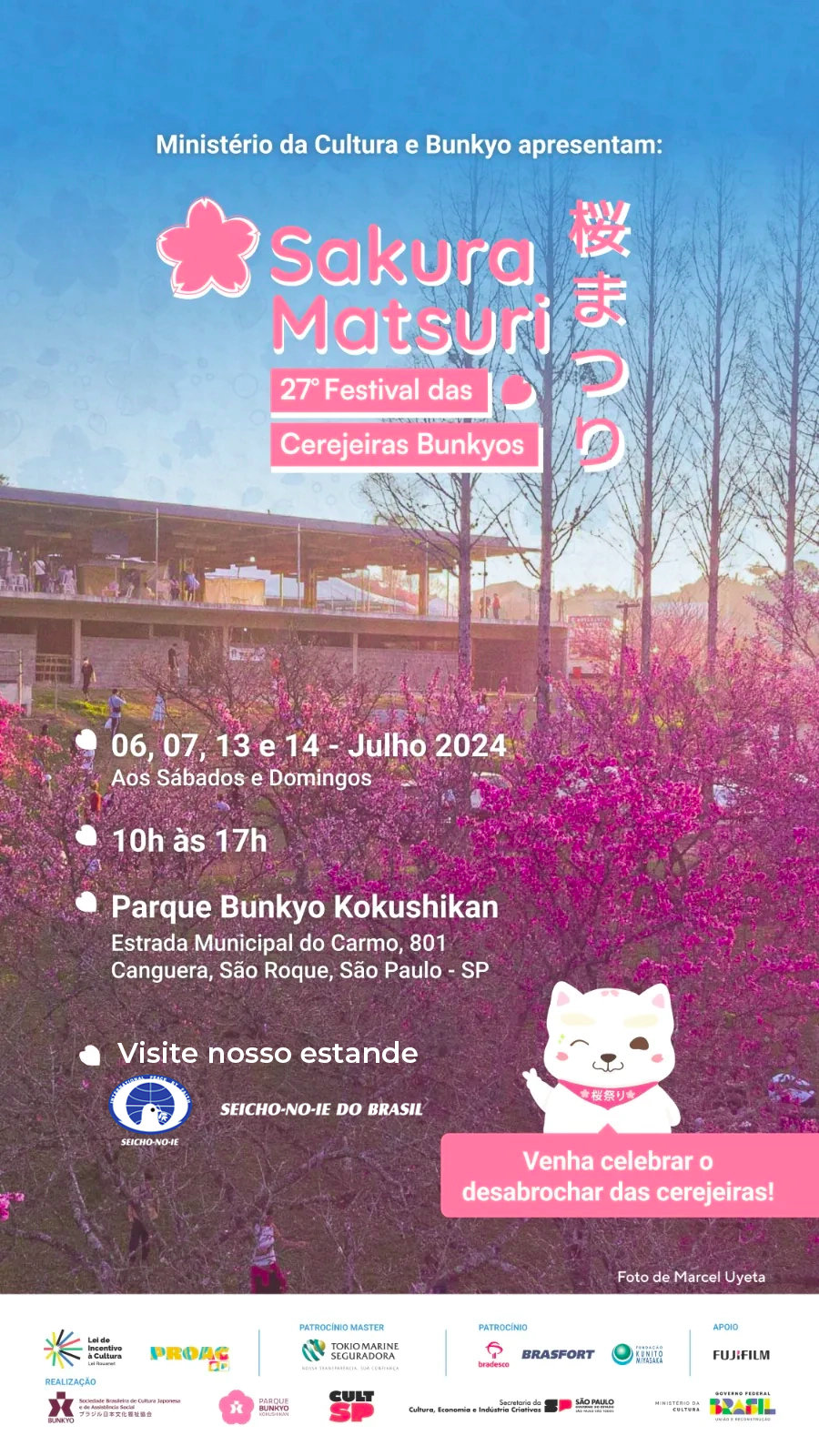 A Livraria da SEICHO-NO-IE DO BRASIL estará presente no evento mais florido do ano! Venha nos visitar durante o 27º Festival das Cerejeiras Bunkyos – Sakura Matsuri, que acontecerá nos dias 6, 7, 13 e 14 de julho de 2024, das 10h às 17h, no Parque Bunkyo Kokushikan, localizado na Estrada Municipal do Carmo, 801, Canguera, São Roque – SP.